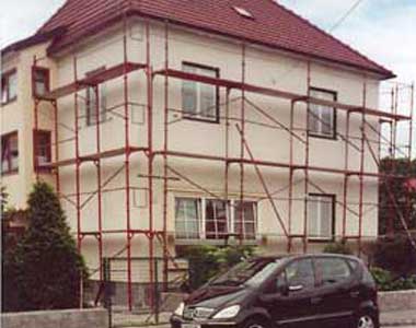 des Hauses vor der Neugestaltung, mit moderner Gerüsttechnik wird